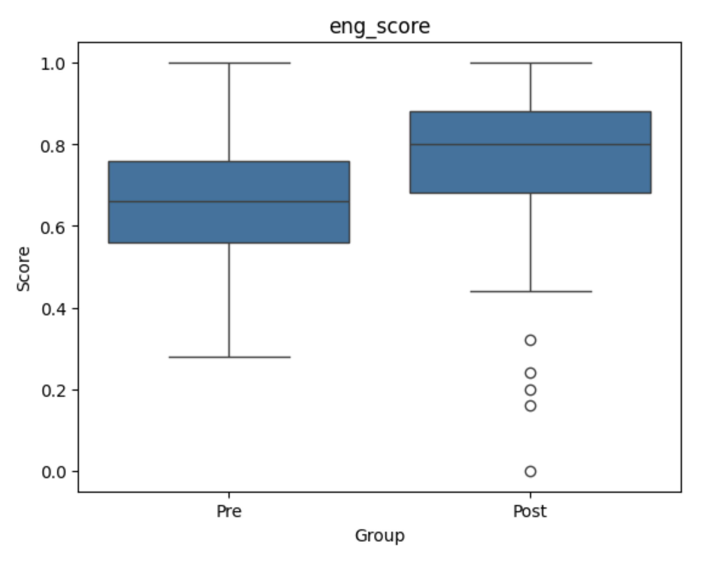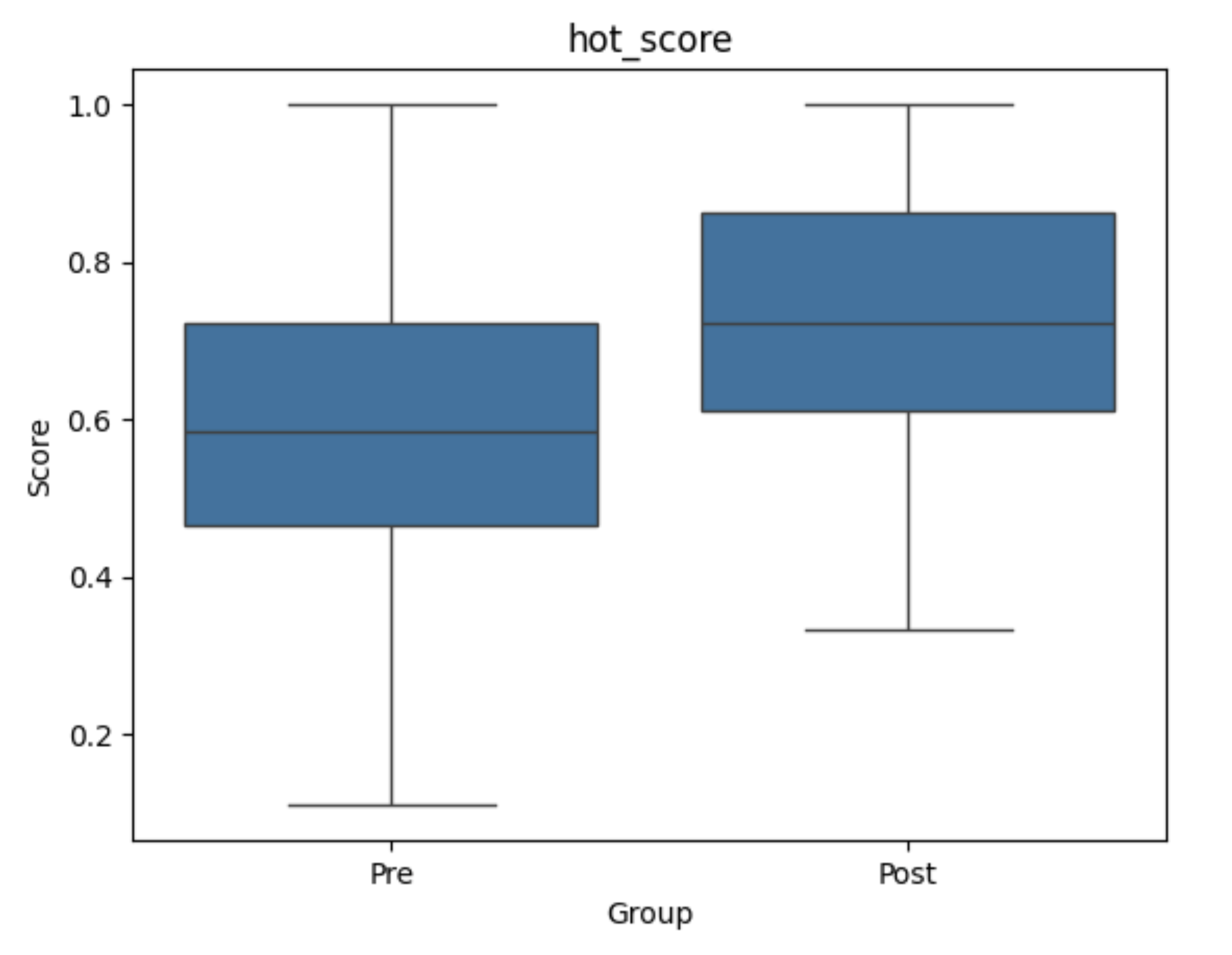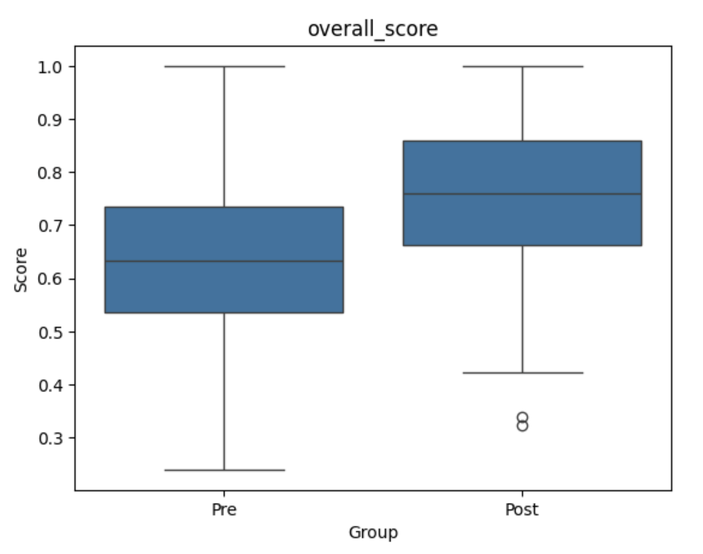 The box plots reinforce the same story. Across domains, medians rose and quartile ranges shifted upward. The higher-order thinking plots show that the lower quartile moved substantially, showing that the intervention may have been particularly beneficial for students who began with weaker performance.