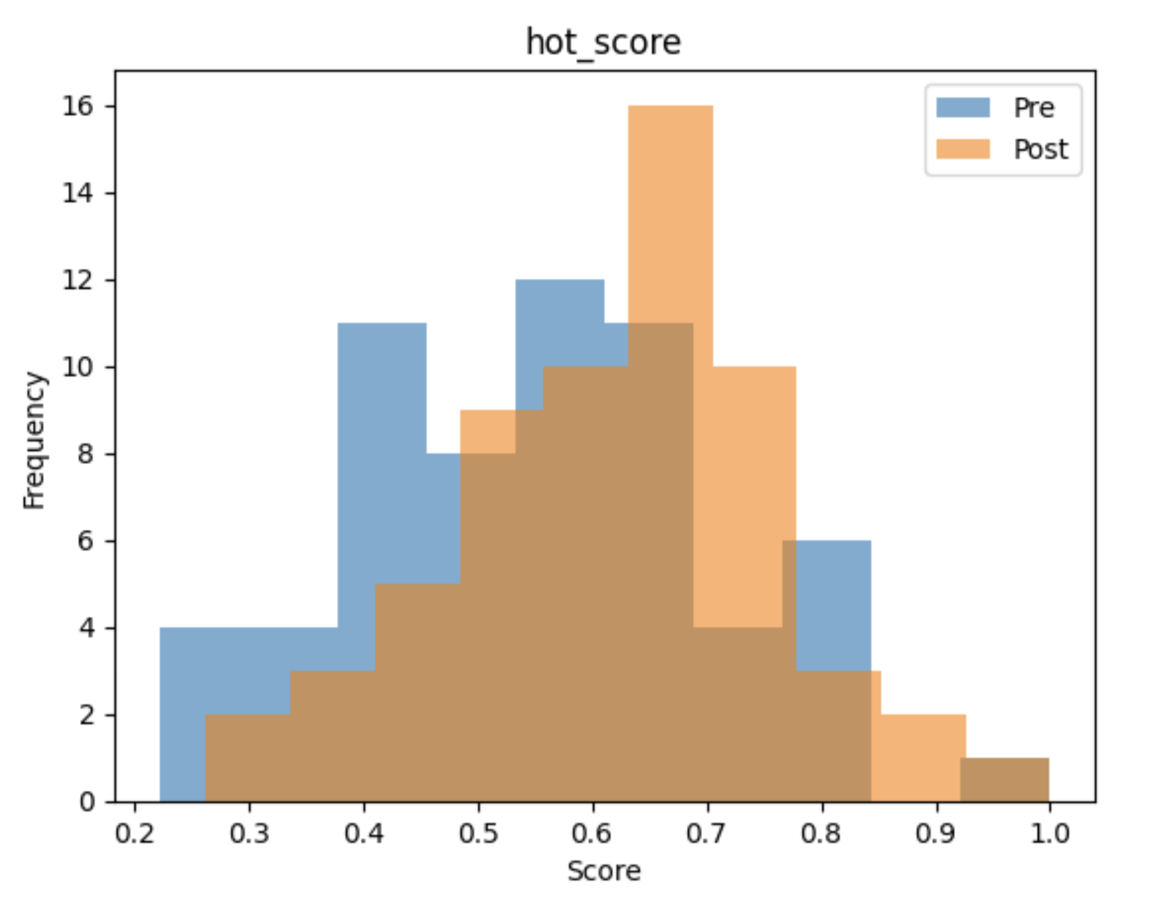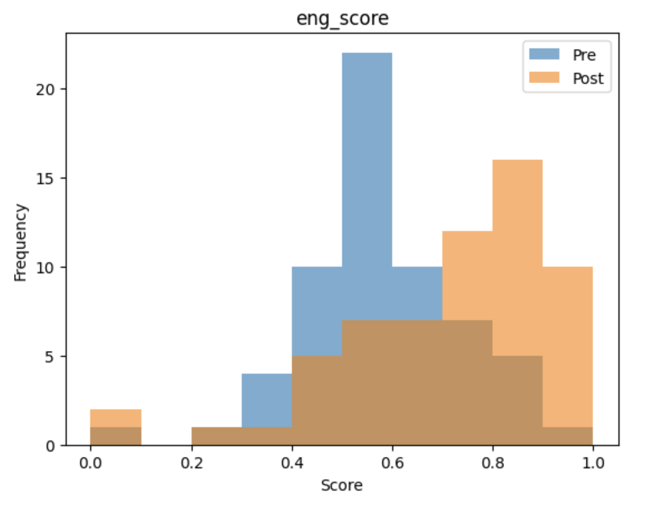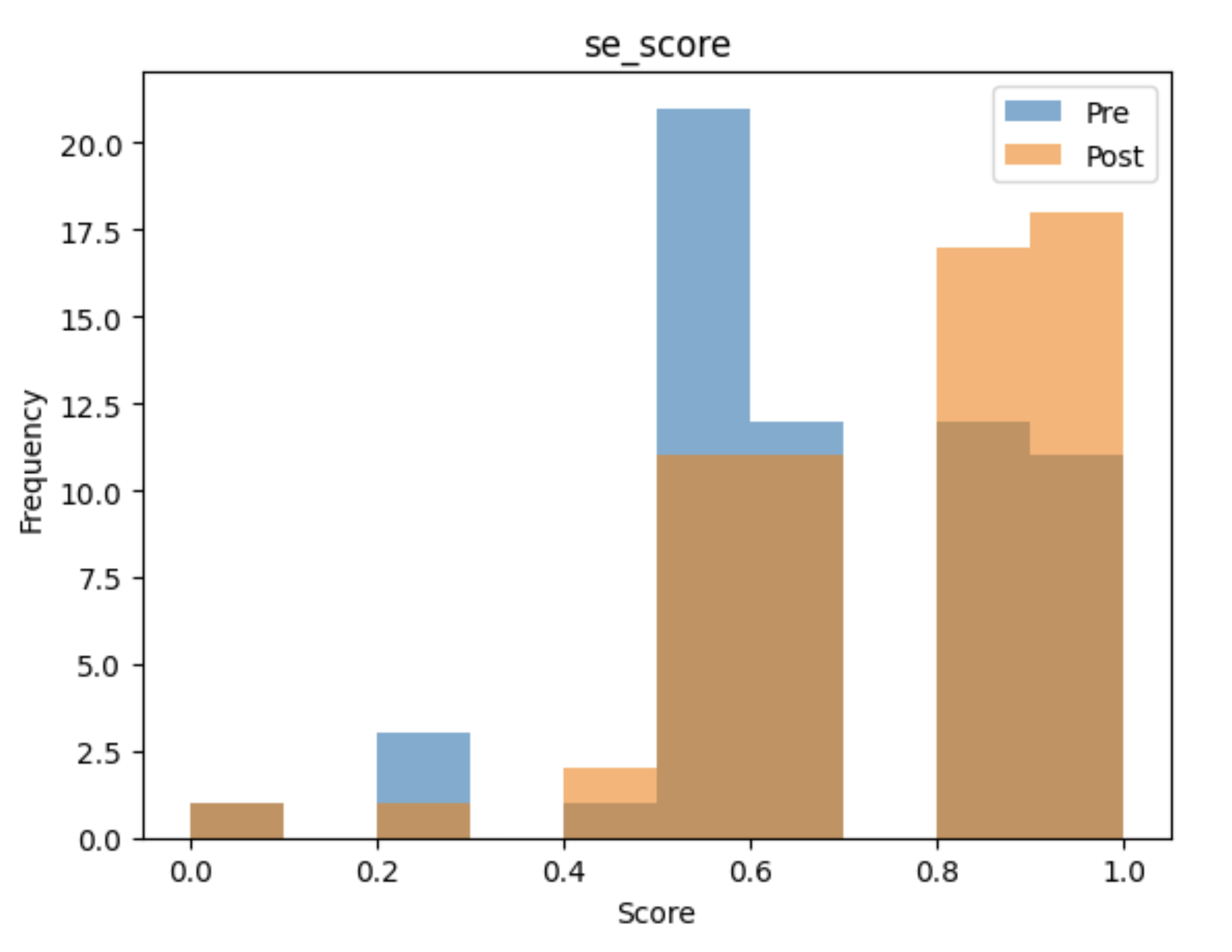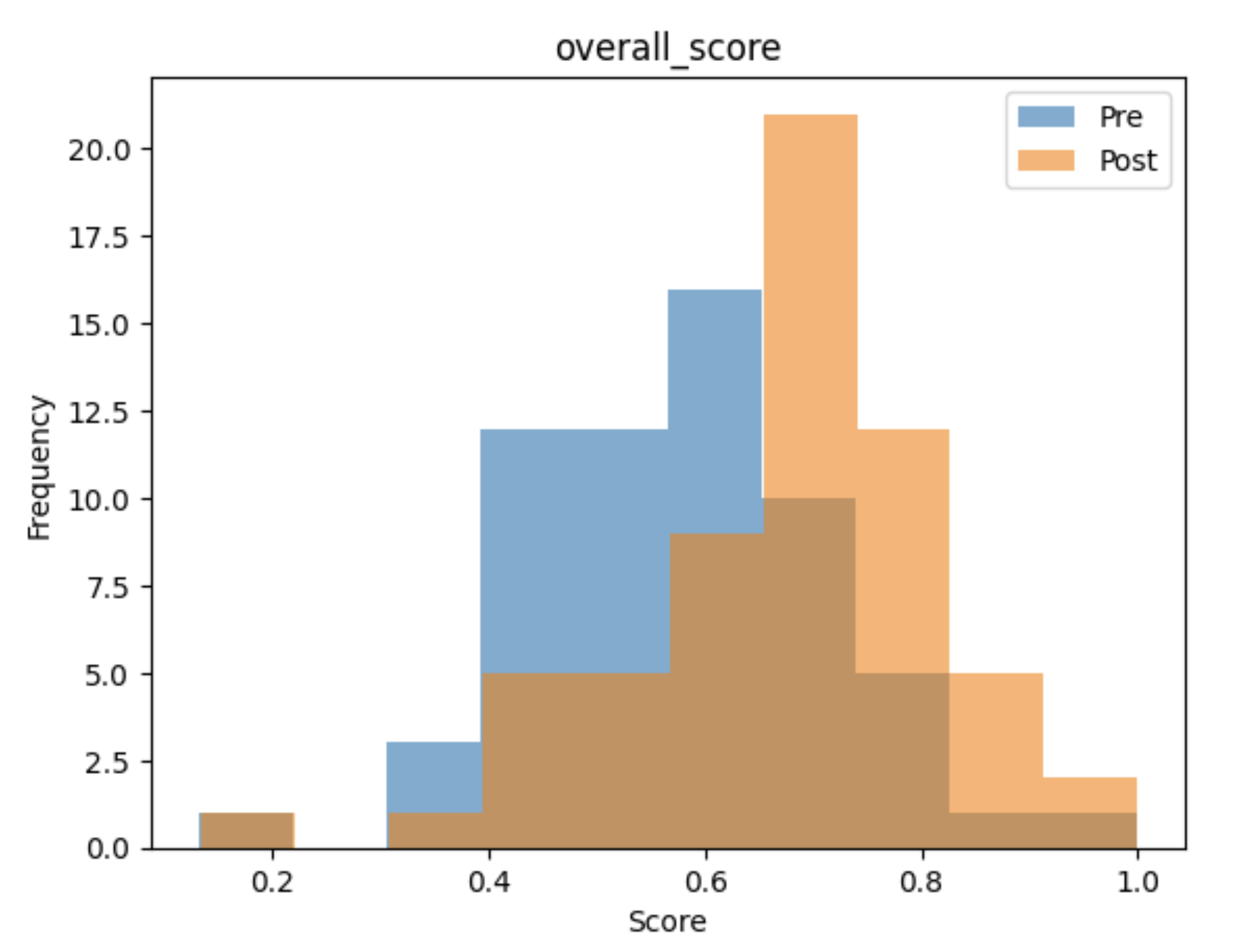 The overlaid histograms show a clear rightward shift from pre-session to post-session scores across all four domains.