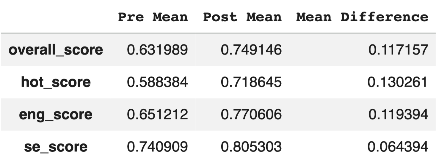 A one-tailed paired t-test was used because the same students completed both the pre- and post-session surveys. For all four score domains, p-values were below the significance threshold of α = 0.05, indicating statistically significant increases in post-session scores.