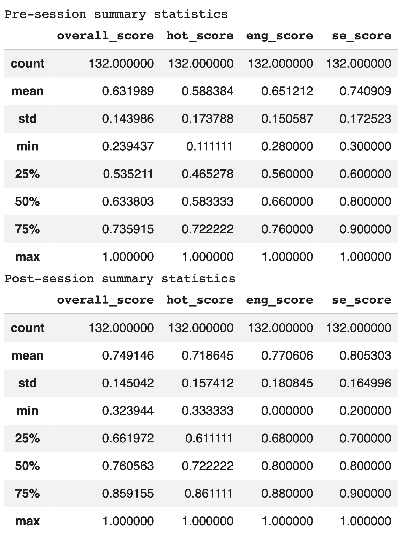 Descriptive statistics for pre- and post-session scores across overall performance, higher-order thinking, engagement, and self-efficacy.