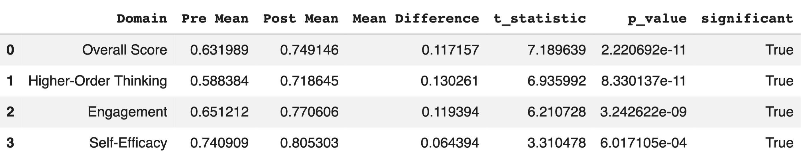 The largest gains appeared in higher-order thinking, with statistically significant increases across all measured score domains.